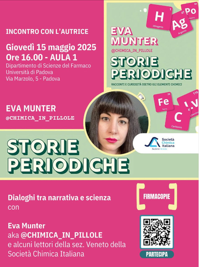 Evento organizzato in collaborazione con SCI - Società Chimica Italiana Sez. Veneto. Iniziativa di divulgazione della chimica legata al libro "Storie Periodiche" di Eva Munter (Apogeo Editore) il libro, che raccoglie 118 storie e curiosità sugli elementi chimici della tavola periodica, e mira a rendere la chimica più accessibile e affascinante.
